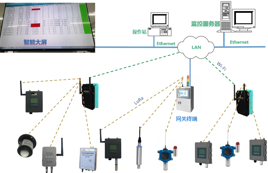 采用傳感器技術(shù),進(jìn)行環(huán)境監測,主要為各類(lèi)氣體、粉塵、溫度濕度監測、實(shí)時(shí)告警、聯(lián)動(dòng)處理(風(fēng)扇等)。