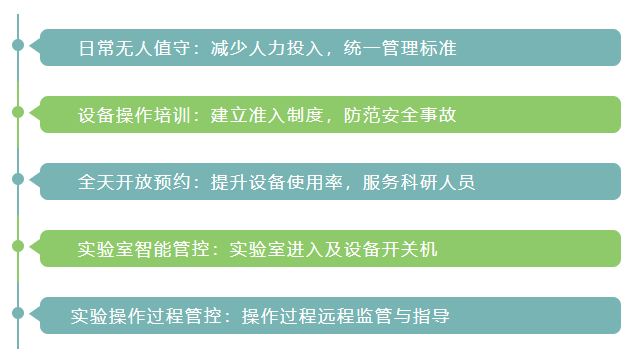 開(kāi)放實(shí)驗室是以7*24小時(shí)實(shí)驗室開(kāi)放為目標,基于智能物聯(lián)網(wǎng)技術(shù)手段,全天候服務(wù)科研人員;同時(shí)將實(shí)驗室管理人員從繁重的日常工作中解放出來(lái),以適應未來(lái)的實(shí)驗室建設需要。