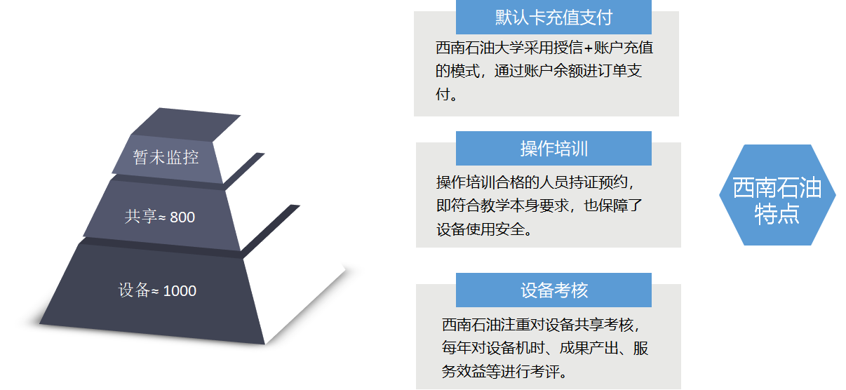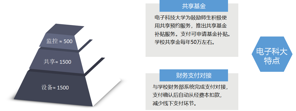 目前學(xué)校的大儀平臺包括大儀共享及設備管控兩大業(yè)務(wù)。其中大儀共享結算直接與學(xué)校財務(wù)系統對接,師生可直接使用校園經(jīng)費卡進(jìn)行預約、使用、結算。同時(shí)支持共享金申請與結算。